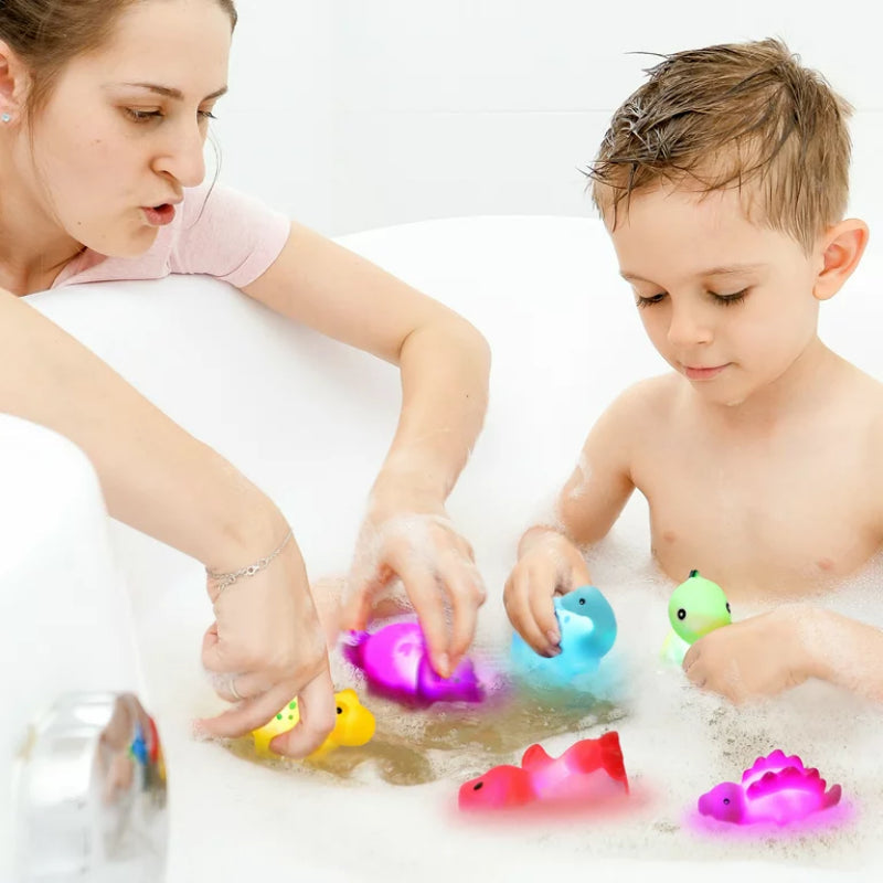 Świecące zabawki do kąpieli wykonane są z najwyższej jakości materiałów. Bez ostrych krawędzi, bezpieczne dla dzieci powyżej 6. miesiąca życia, łatwe do chwytania. Trwałe, nie trzeba się martwić o odpryski ani stłuczenie.